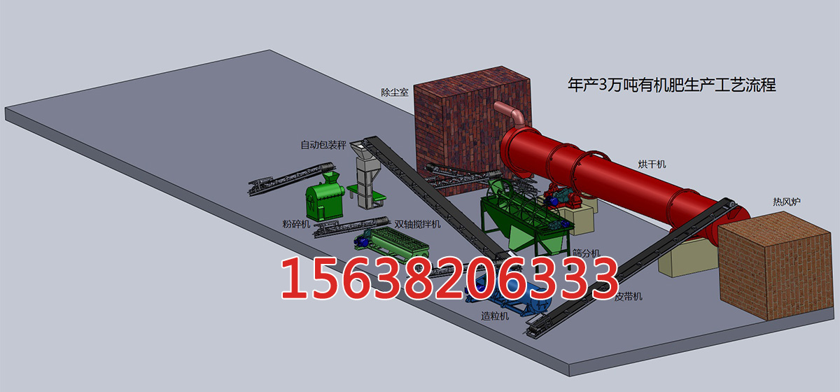豬糞有機(jī)肥生產(chǎn)線,加工商品有機(jī)肥需要兩個步驟:前期發(fā)酵與處理部分和深加工造粒部分。生物有機(jī)肥設(shè)備配套需要發(fā)酵翻拋機(jī)、有機(jī)肥粉碎機(jī)、滾筒篩分機(jī)、臥式混合機(jī)、圓盤造粒機(jī)、回轉(zhuǎn)烘干機(jī)、冷卻機(jī)、篩分機(jī)、包膜機(jī)、包裝機(jī)、輸送機(jī)等設(shè)備。有機(jī)肥生產(chǎn)線工藝流程如下: ?、僭习l(fā)酵---②原料電腦皮帶秤自動配料----③破碎、混料-----④轉(zhuǎn)鼓造粒-----⑤烘干有機(jī)肥...