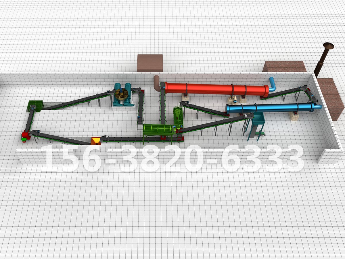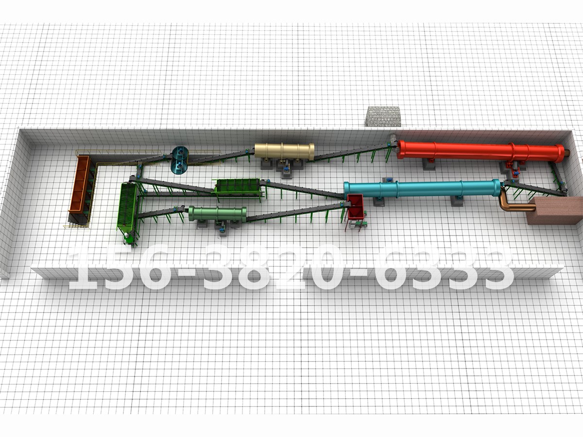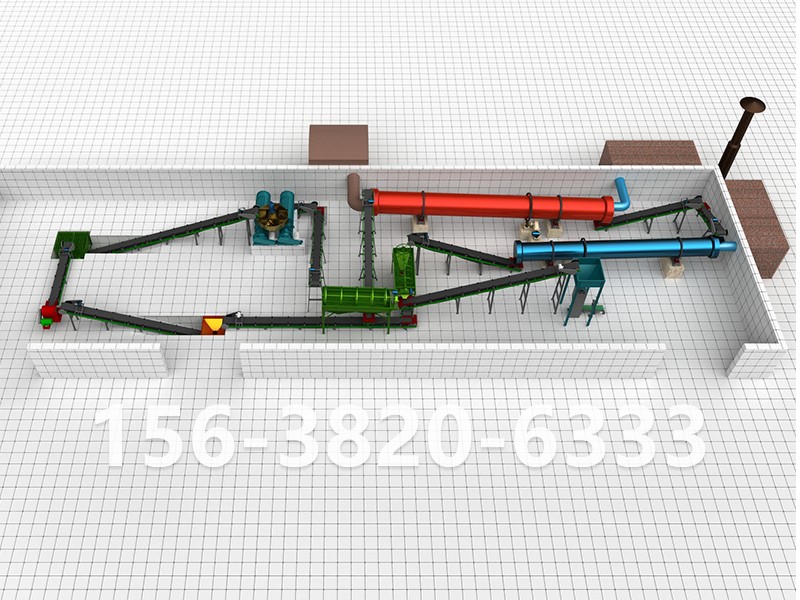 發(fā)酵腐熟的雞糞經(jīng)輸送機(jī)送入粉碎機(jī)粉碎后,細(xì)度80目物料占65%以上,通過輸送帶送入有機(jī)原料倉,經(jīng)電子計量后與其他原料(氮磷鉀)一同進(jìn)入原料粉碎機(jī)進(jìn)行二次粉碎及混合,粉碎混合好物料經(jīng)皮帶輸送機(jī)送入轉(zhuǎn)鼓造粒機(jī),在轉(zhuǎn)鼓造粒機(jī)內(nèi),物料在添加水及蒸汽的情況下,原料溫度被提升,物料自身粘性被激發(fā),在轉(zhuǎn)鼓造粒機(jī)的不斷滾動下,物料逐漸滾動成球,從而在造粒機(jī)尾部流出經(jīng)皮帶輸送機(jī)送入圓盤造粒機(jī),在圓盤造粒機(jī)大傾...